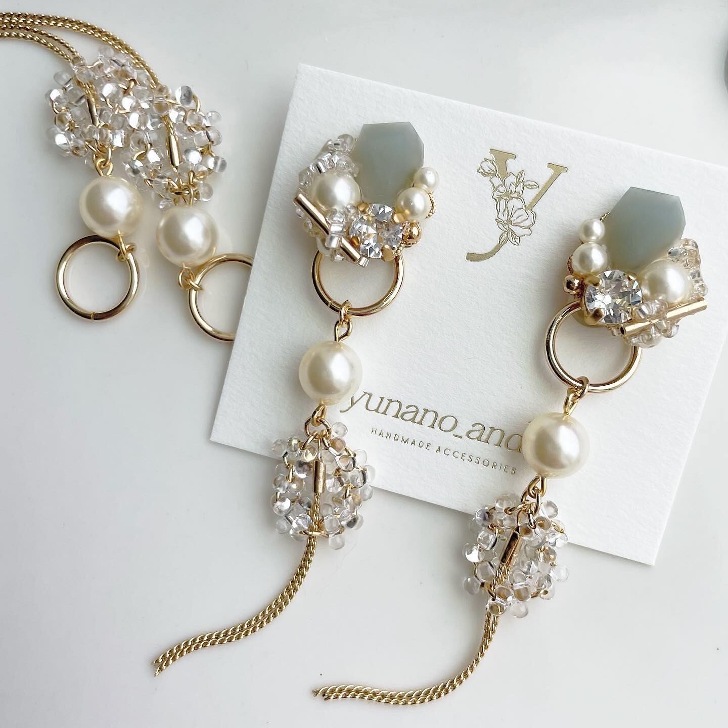 今回は宝石の形のライトブルーレジンを作り、そこからマット加工をし、透けすぎないようにさらに加工をし6㎜クリスタルストーンと2種類のクリアビーズ、クリスタルパールを合わせたビジューに、取り外し可能なぶら下がりのチャームもつけ、ロングでシルエットまでとても上品な大人可愛いデザインに仕上げました♡