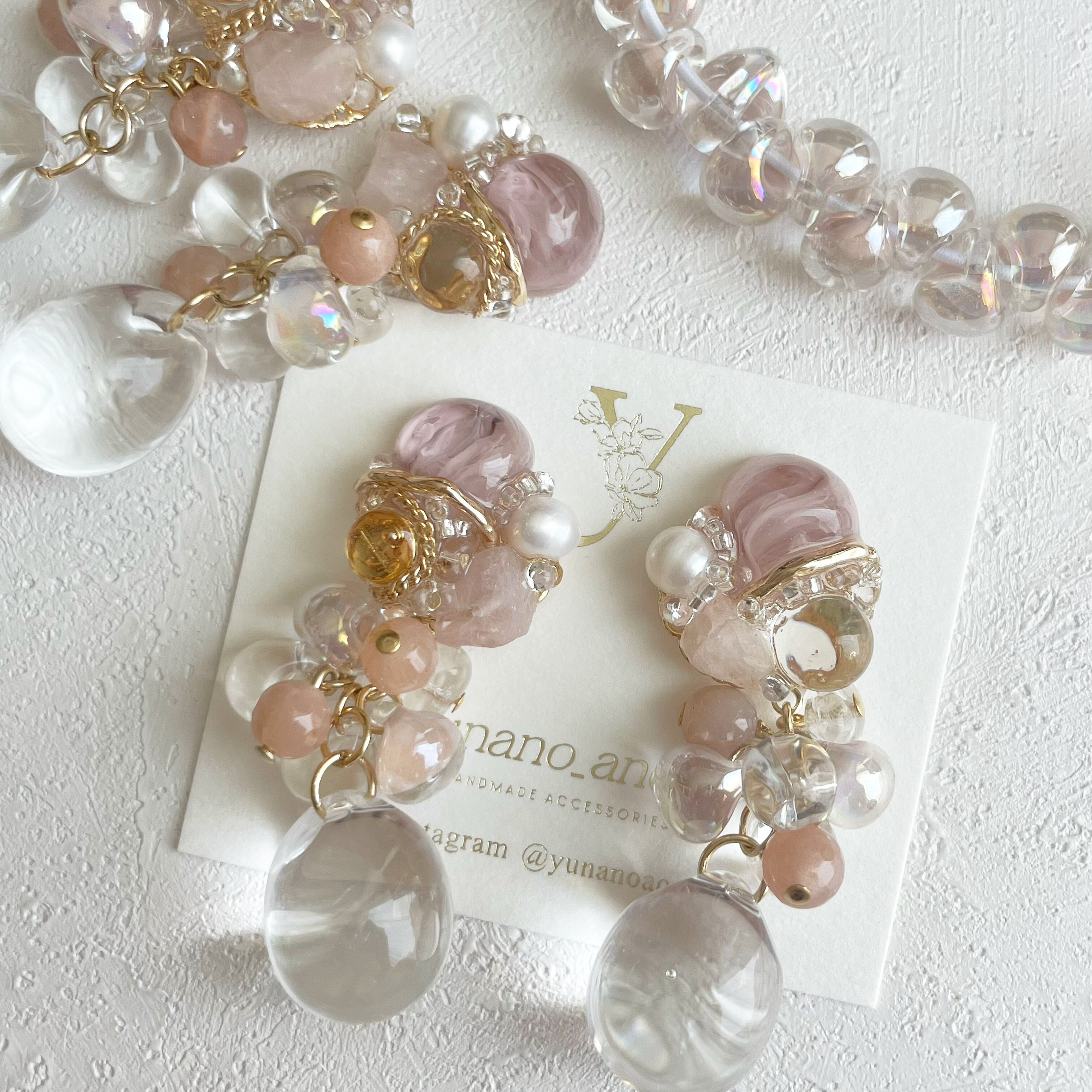 ビー玉のようなクリアピンクレジンを天然石、クリアレジン、淡水パール、ガラスビーズなどと合わせレジンビジューにし、