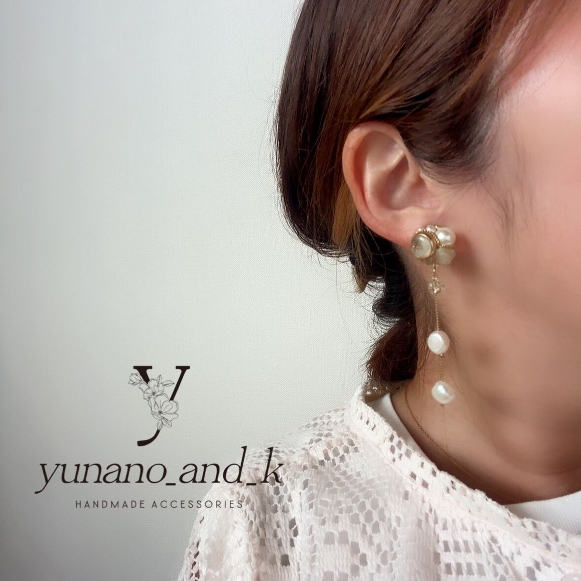 チャームには良質な国産淡水パールを左右で4粒ぶら下げました。